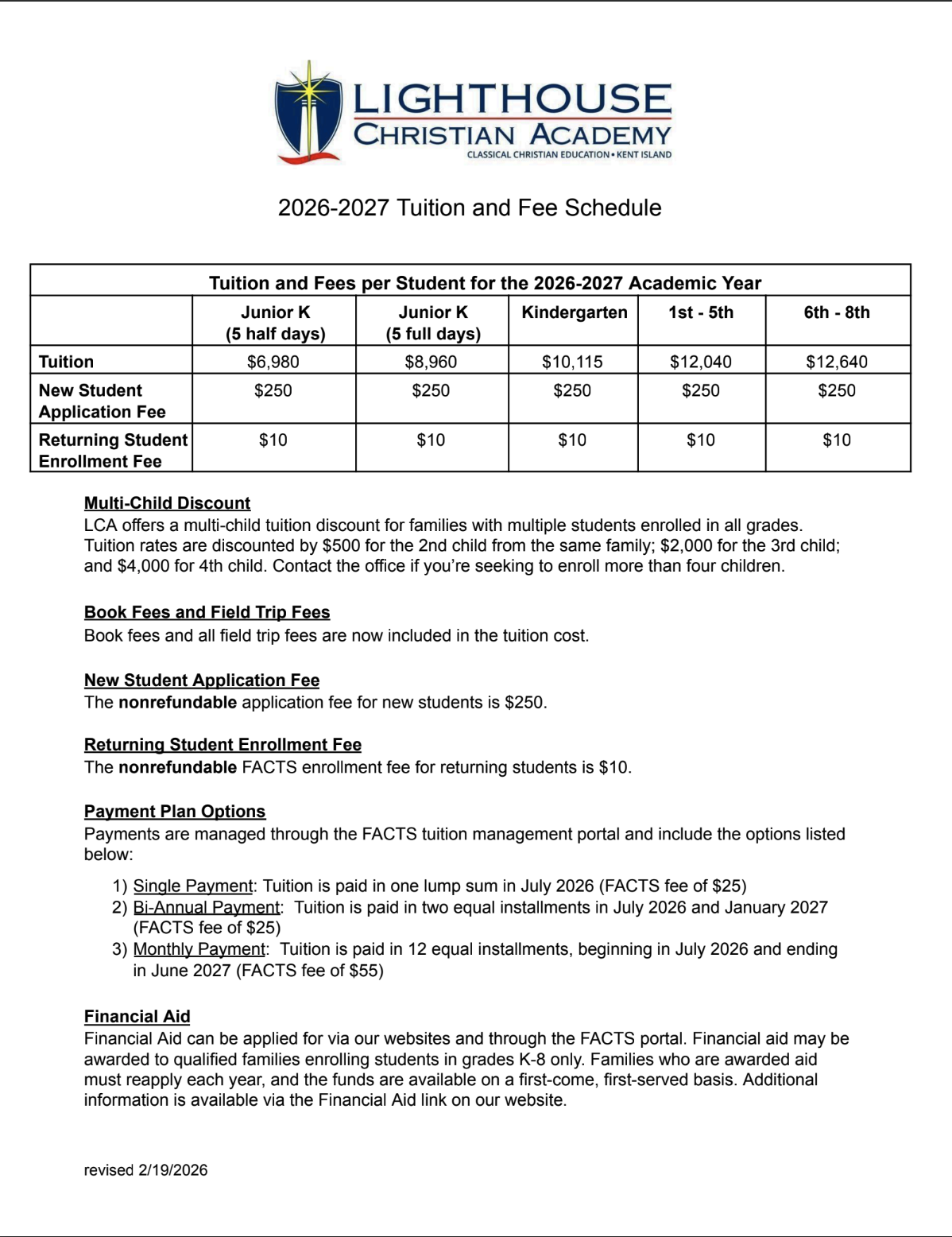 The request for tuition assistance for new students is a separate process from the admission process and does not affect one’s application for admission. Once families have completed the application for Admission into LCA, they may begin the Financial Aid application process.